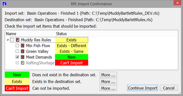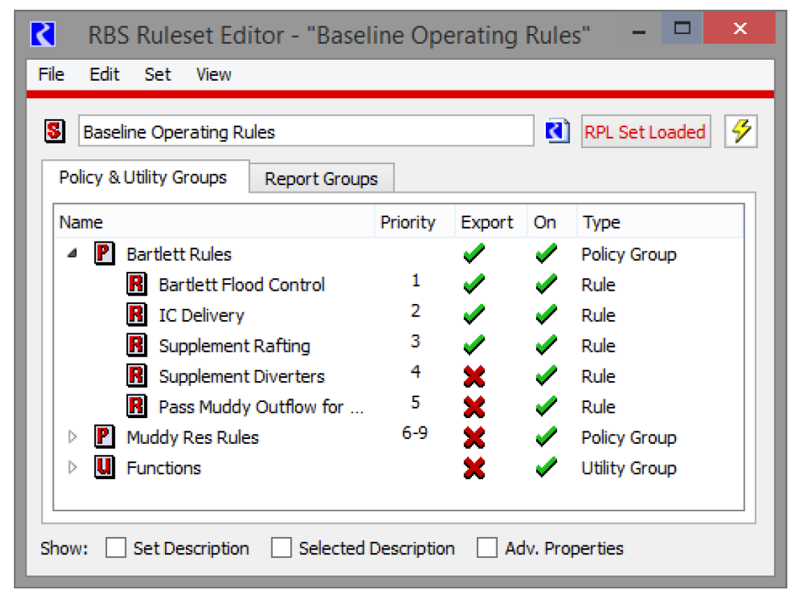 In this section we describe how to export all or a portion of a RPL set to a separate RPL set file, as well as how to import an existing RPL set file. The export and import mechanisms provide a way to incorporate all or some of one policy into another policy, and it is available for all application of RPL within RiverWare, including the following: