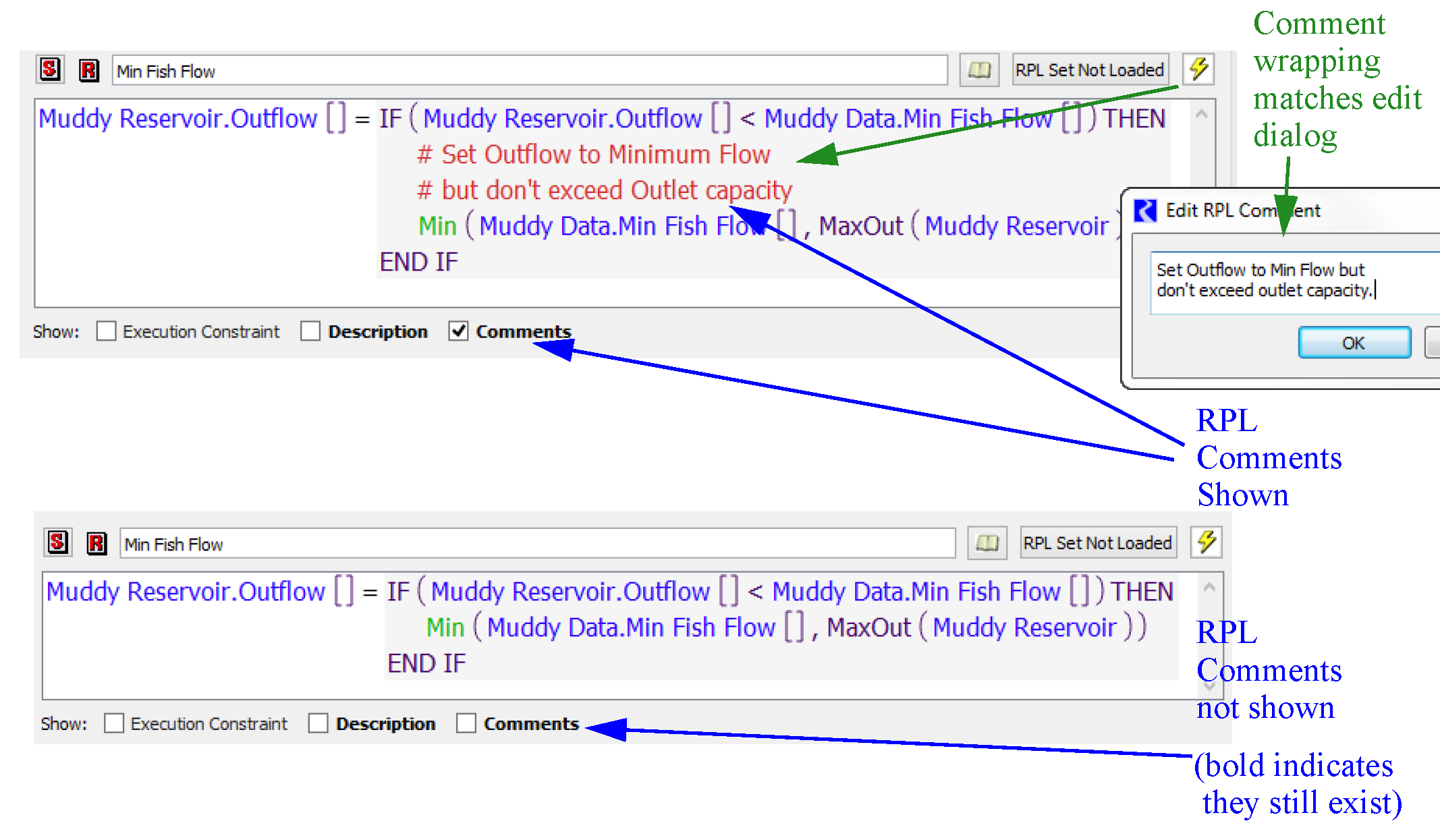 Inline RPL comments can be optionally shown/hidden using the View, then Show Comments menu or the Comments toggle.
