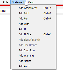 Blocks are constructed from statements at the top level, and statements are constructed from expressions. The following statements are available for RBS, Initialization and MRM rules and accounting methods. They can be selected from the Statement menu in the RPL Viewer or the individual rule or accounting method dialog.