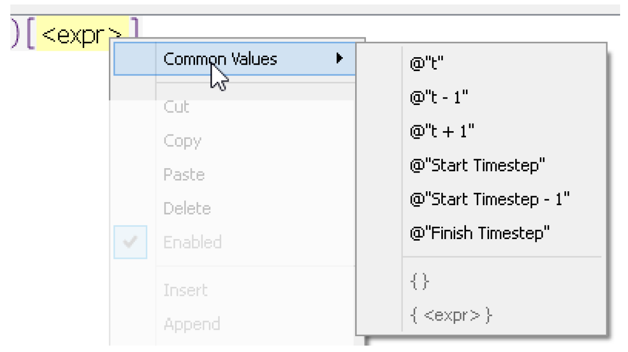If part of an expression can be used in another assignment, rule, or function, rather than repeating the above process for each new expression, highlight the portion of the expression that can be used elsewhere. From the menu bar, select Edit, then Copy or type <Ctrl C> to copy the highlighted portion. Right-clicking the highlighted portion will bring up a menu with the option to copy. In the location in which the expression is to be pasted, highlight the <expr> and select Edit, then Paste <Ctrl V>, or right-click and select Paste from the menu. This will paste the expression into the new location.