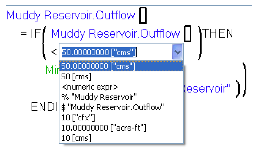 To replace an unspecified expression with a literal value (like 10 “cfs” or TRUE) double-click the expression and type in the value. For NUMERIC data types, you may also enter a unit. If the unit has a “-” or “/” in it, you must include the quotes when typing the unit, like “acre-feet”. Without these special characters, you can type the units and no quotes. Here are some examples of correctly specified units: 10 cms, 100 “acre-ft”, 50. Illegal entries include 100 acre-ft/day (no quotes) and 100 “cfx” (no unit of that type). See
