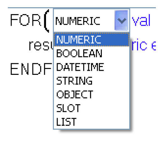 FOR (NUMERIC val IN <list>) WITH NUMERIC result = <numeric> DO