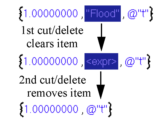 Note: There is one exception to the cut/delete behavior. When deleting an item in a list, the first cut or delete operation removes the expression but leaves a blank expression. A second cut/delete removes the item from the list.