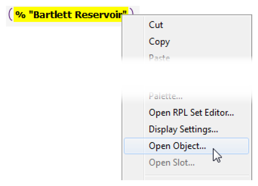 When the selected RPL expressions is a valid OBJECT or SLOT, the following right-click context menu selections open that object or slot dialog.