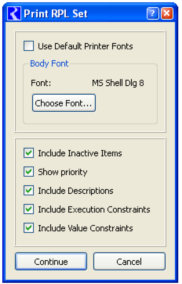Using the print dialog, the block, function, group, or RPL set can be sent directly to the printer or to a file. You may select landscape or portrait printing. You may choose to include or exclude inactive items, descriptions, execution constraints, and value constraints. You may also choose the print font. A note on font selection. The font selection dialog presents a list of fonts that are available on computer console, these fonts may or may not all be available on the printer. If the font is not available on the printer, a default font will be chosen by the printer and the printout may be misaligned—formatting will be corrupted. Some experimentation may be necessary to determine which fonts an individual printer supports.