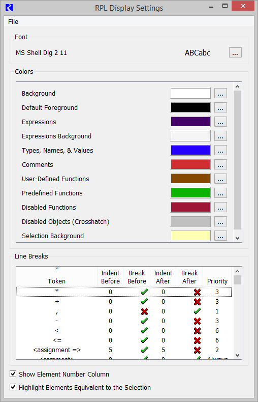 There are three areas to this Display Settings dialog, Font, Colors, Line Breaks, Element Numbers, and highlighting of equivalent expressions, shown in Figure 2.28 and described in the following sections.