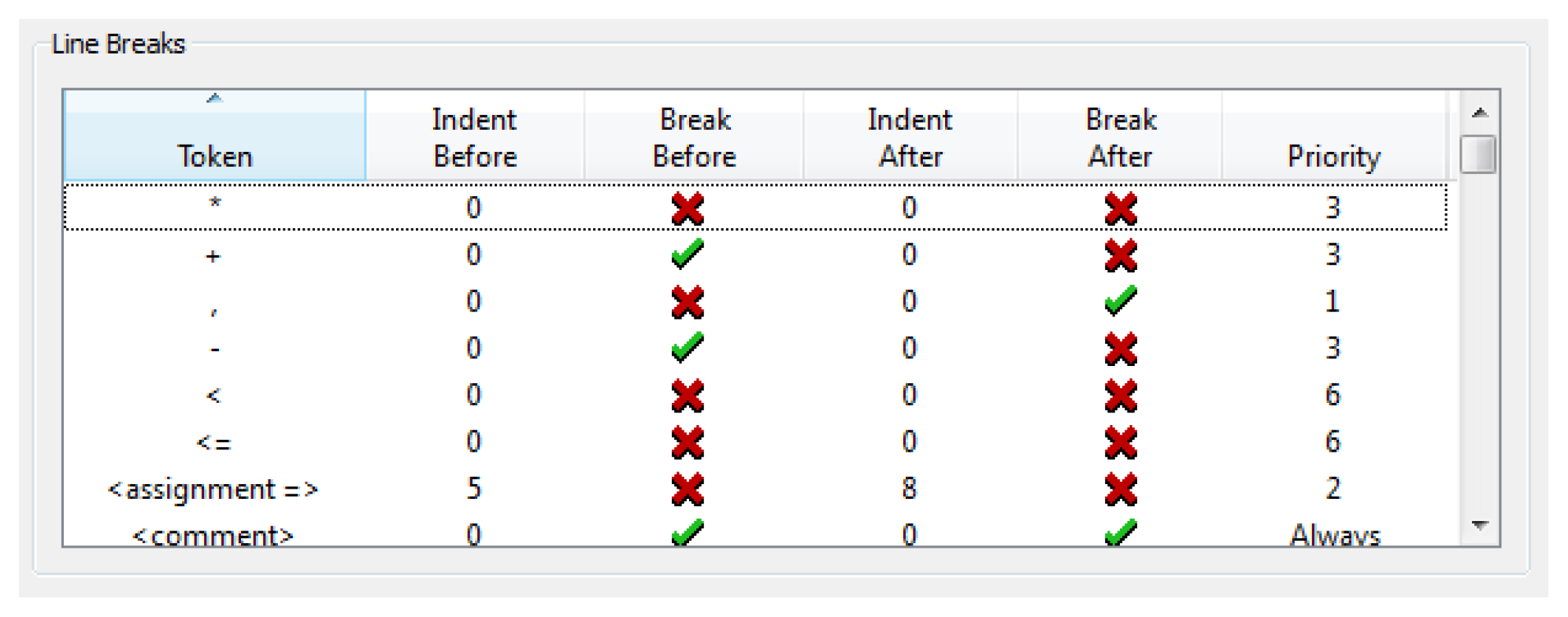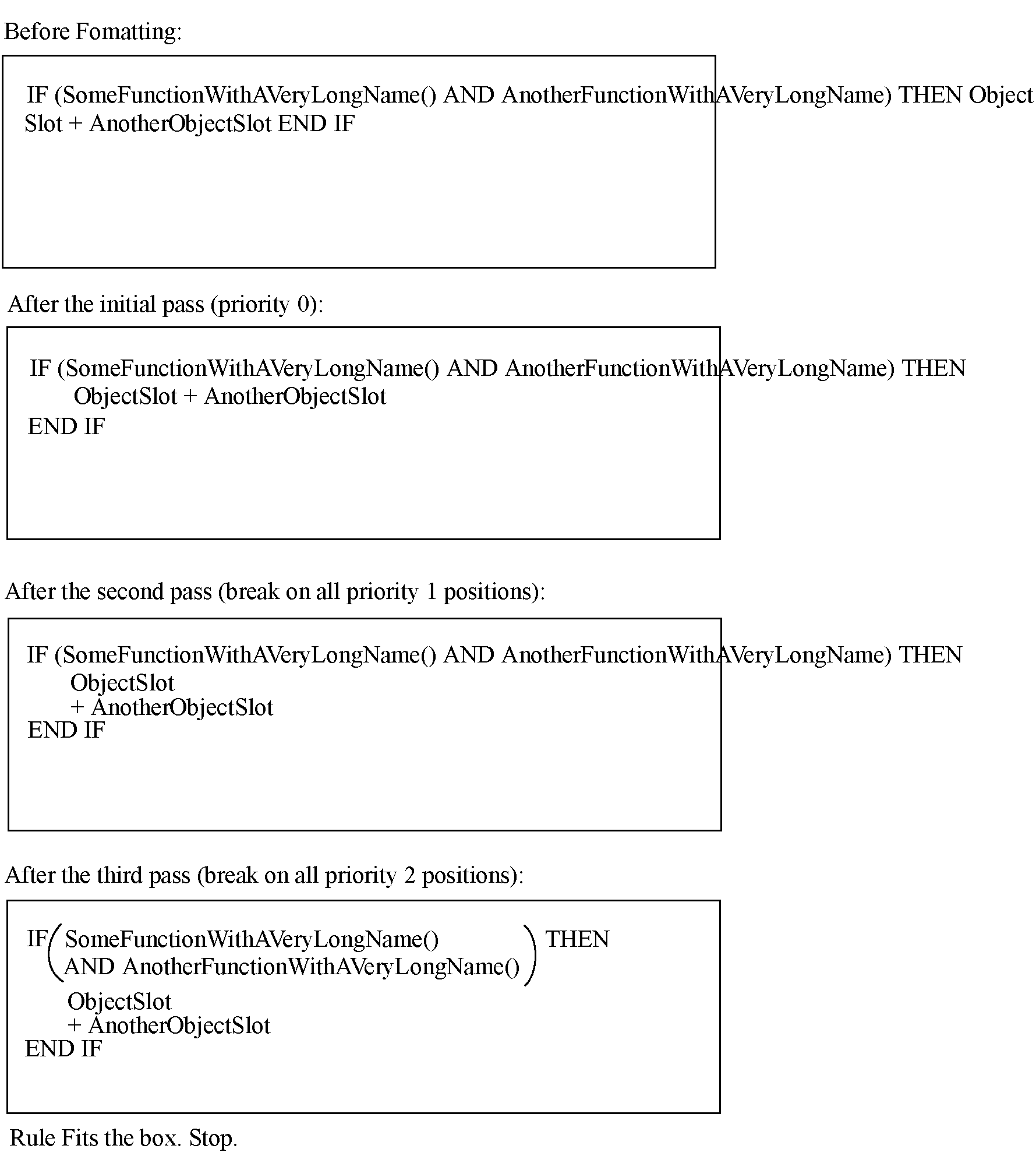 1. The formatting algorithm makes an initial pass, breaking the block at priority 0 tokens. All line break defined with priority 0 (i.e., Always) in the RPL Display Settings dialog will be formatted in this initial pass. This pass always occurs.