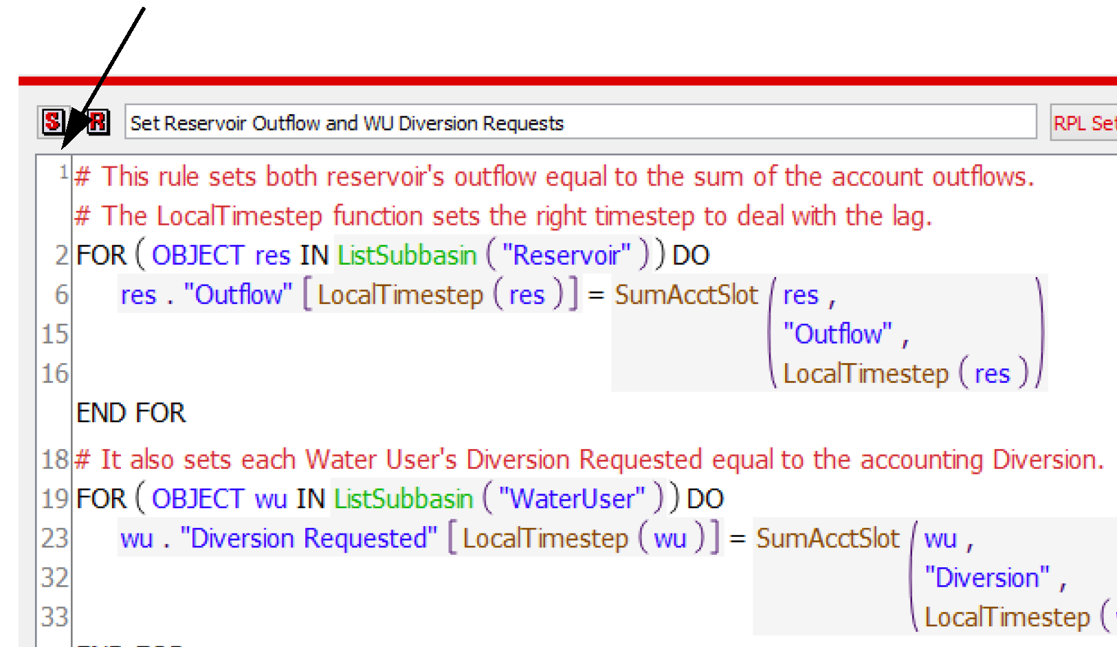 Expressions written in the RiverWare Policy Language can be complex and very long. RiverWare provides a RPL Display Settings dialog to control the fonts, colors, showing element numbers, and a dynamic formatting algorithm. This algorithm formats the blocks to fit the width of desktop window or a printer’s page. The dialog is accessed through the Display Settings button in the editor Set menu. These settings will be automatically saved in the model file. This allows RPL logic to look the same from one user to the next.