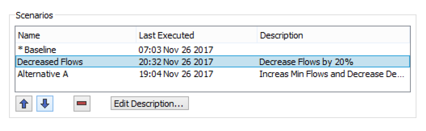 To edit a description, select the scenario in the list, then select the Edit Description button. Edit the text in the description field.
