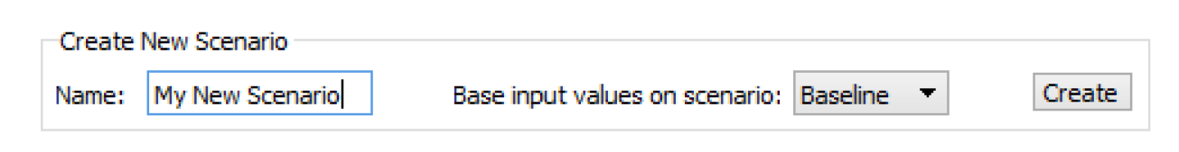 Enter a name into the Name field of the Create New Scenario box, then select one of the currently listed scenarios on which to base the input values of the new scenario. When the new scenario is created, its input values will be identical to those of this scenario. Select the Create button to have the new scenario appear in the list.