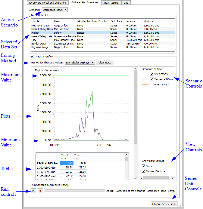 When a table data set is selected, the edit panel displays a table of values. The rows are indexed and may also have a text label. The color-coded columns, one for each scenario, show units and possibly a title. Only values in columns associated with the active scenario can be edited.