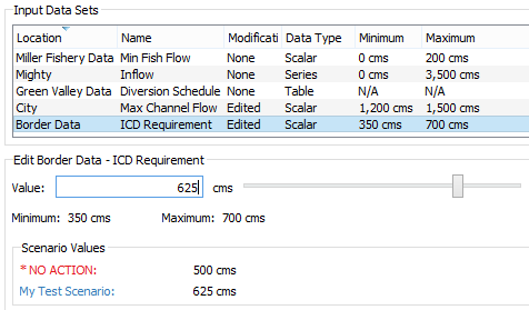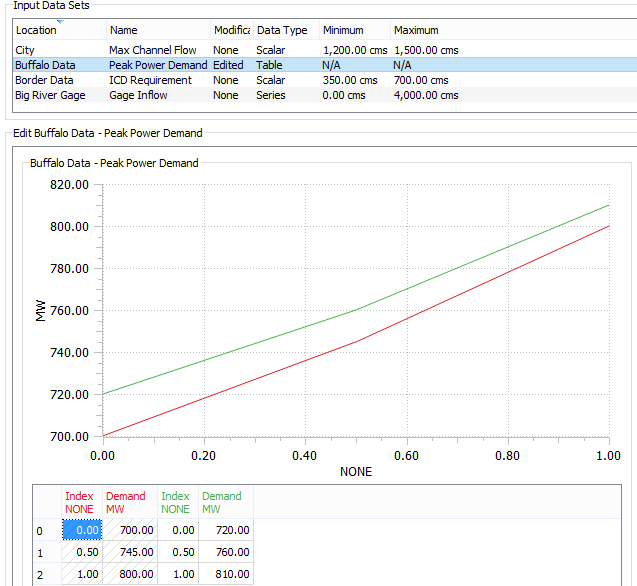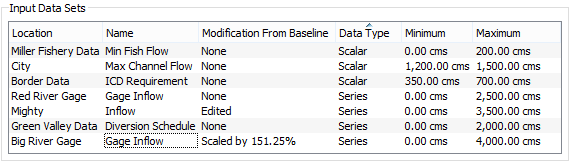 To change the values for one or more input data sets, select the data from the Input Data Sets list. Then, controls for modifying values are displayed below the Input Data Sets list. These controls vary according to the data type, Series, Scalar or Tables, or sometimes the units of the data.