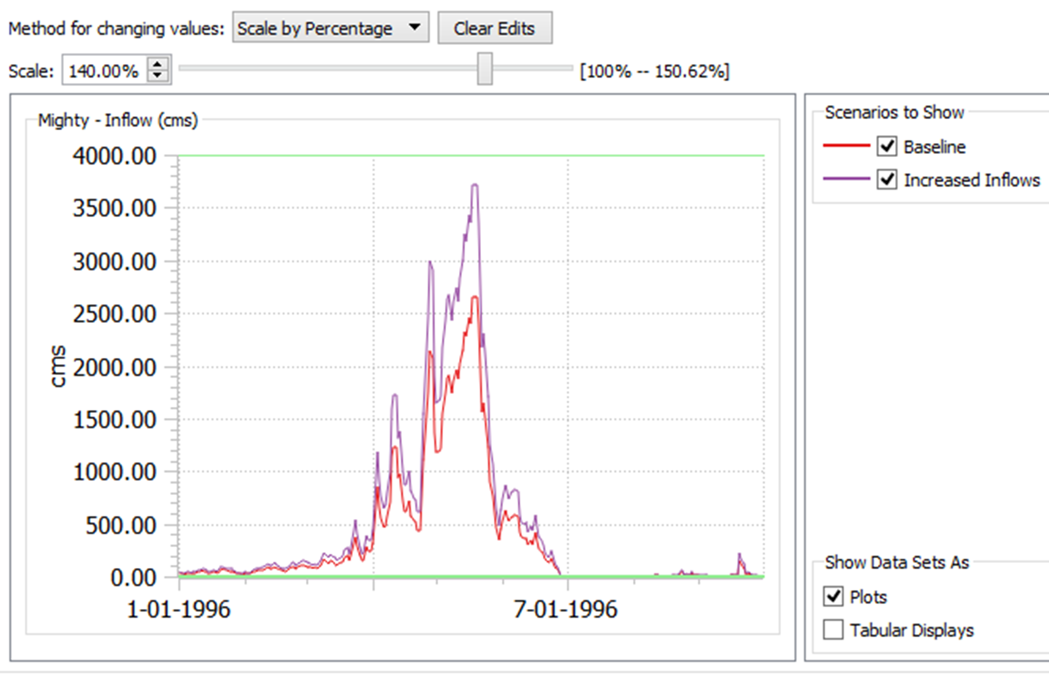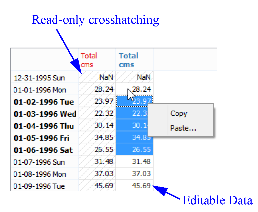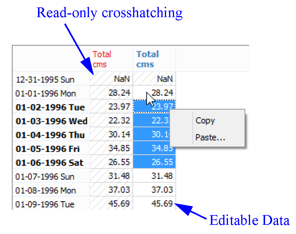 Only values for the active scenario can be edited, and of those, only those that were provided as inputs to the original RiverWare model run can be edited. That is, if the series value for a particular date was computed by RiverWare and not originally input by the model developer, then it is not editable. Non-editable values show cross-hatching and cannot be changed.