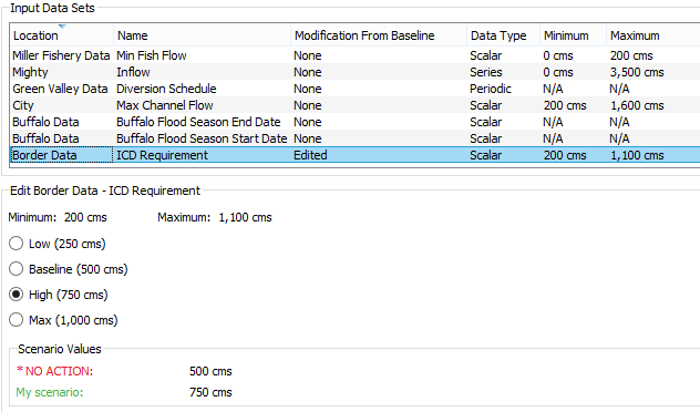 • Modification from Baseline. Indicates whether the data in the data set for the selected scenario differs from the data in the baseline. “None” indicates that no modification from the baseline values has been made; “Edited” indicates that one or more values have been changed.