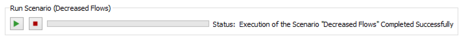 After modifying input values, execute the scenario to generate the new results. Select the Run button at the bottom of the panel. The bar to the right indicates the progress of the simulation, and the Status label reports the state of the simulation.