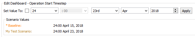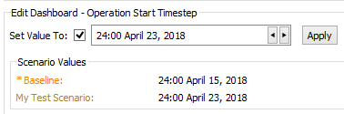 In addition to editing numeric values, that is, a number with or without units, in some cases, developers may export series, table, or scalar values that represent date and time values. When these date and time values have been exported, the edit panel of the “Edit and Run Scenarios” tab presents controls for specifying a date & time value.