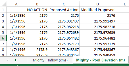 Within a worksheet, the first column contains the series date and times and each subsequent column contains the data for a different scenario. Values are written for the entire run range, including the initialization date. The string “NaN” (Not A Number) is written if a data set does not have a value for a given timestep or if that value is invalid.