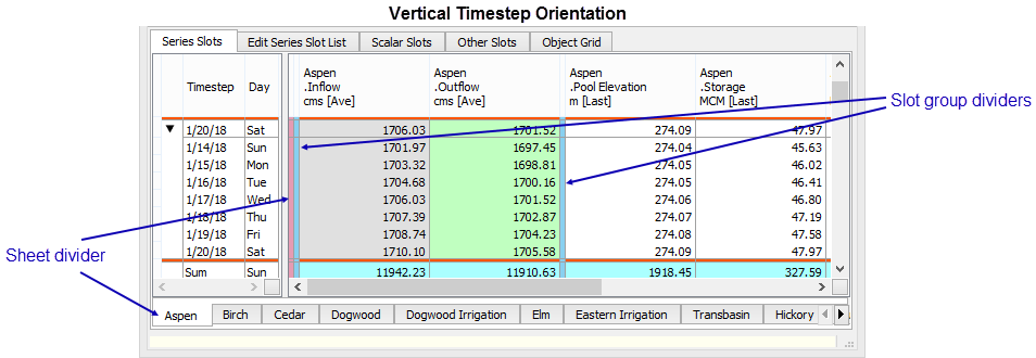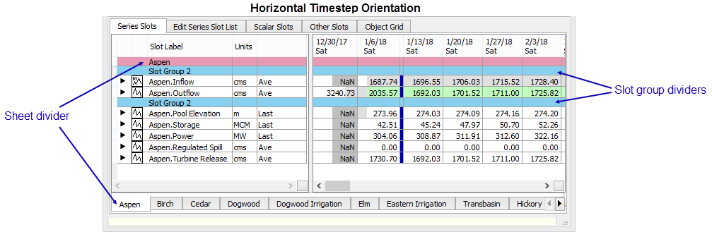 Figure 2.9  Sheet and slot group dividers in horizontal timestep orientation