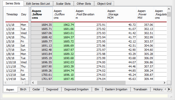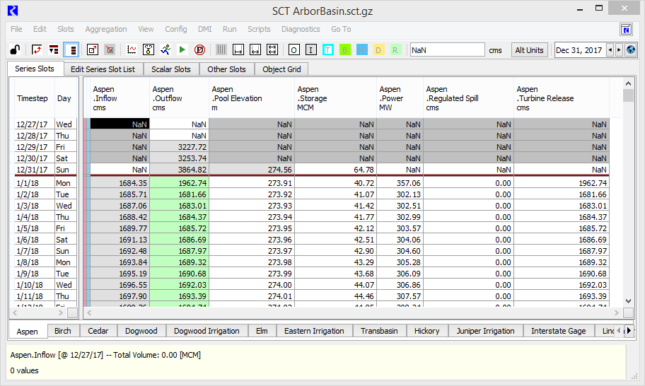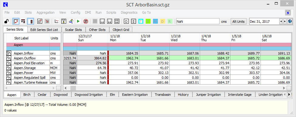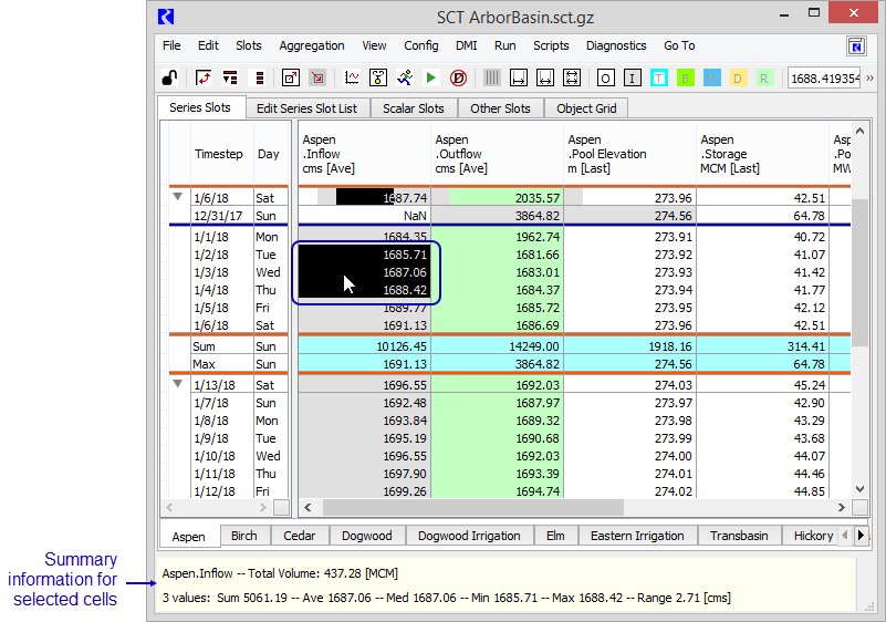 Numeric time series slot values are stored internally as double-precision floating point numbers. Cell values are displayed in the SCT, as with the rest of the RiverWare user interface, in a user-defined display precision. Display precision specifies the number of fractional decimal digits to which the internal value is rounded. The SCT uses the display precision for each slot as defined in the active unit scheme; see Unit Schemes in User Interface for details.