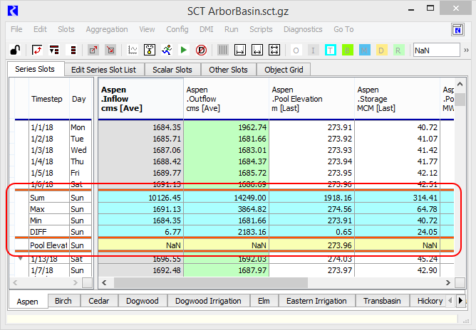 For display and some data export purposes, you can aggregate timesteps within each series slot according to user-selected summary functions. Timestep data is aggregated into an aggregation interval size larger than the timestep interval size. You can aggregate a fixed number of timesteps per summary (for example, aggregate three timesteps per summary), or you can aggregate timesteps into a regular interval (for example, aggregate one-hour timesteps into daily summaries). See Timestep size for details.