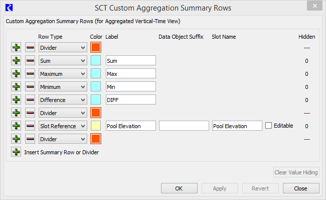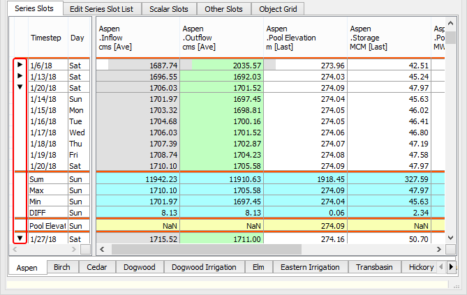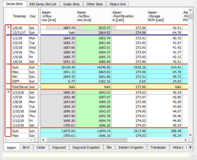 For aggregated, vertical timestep view, you can specify any number of custom summary rows at the end of each time aggregation. Each custom summary row can be configured to display the value of a simple arithmetic function or the value of a referenced series or scalar slot. Optionally, you can assign a user-defined background color to each custom summary row.