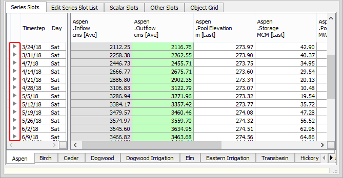 By default, the SCT uses the same timestep size as the model. Optionally, you can configure the SCT to use any timestep size supported in RiverWare. Each SCT can display only one timestep size for all series slot sheets; however, you can create and view multiple SCTs that show different timestep sizes. When an SCT is shown for a different timestep than the model, the timestep size is added to the title bar of the SCT.