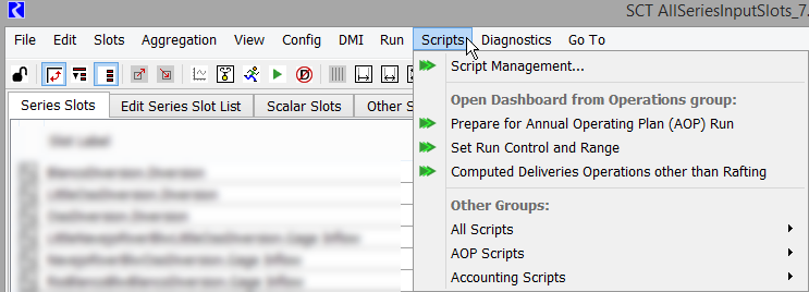 RiverWare scripts can be an integral part of operating a model. The SCT Scripts menu includes all scripts defined for the model. You can open the Script Dashboard directly from the SCT and use it to configure settings and run a selected script. You can also open the Script Manager to edit scripts.