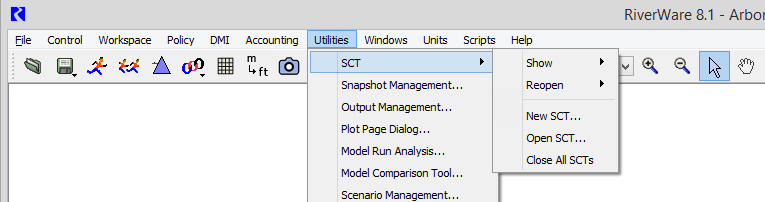 To access the SCT, select Utilities, then SCT on the RiverWare workspace.