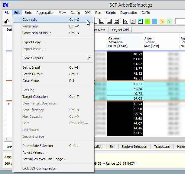 Use this procedure to copy multiple timeseries values from one slot and paste them to the same timesteps on a different slot. The target slot can be in the same or a different SCT, and it must have the same unit type as the source slot.
