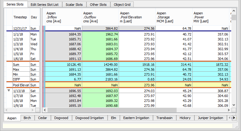 You can configure each custom summary row to display the value of a simple arithmetic function or the value of a referenced series or scalar slot for each simulation object column. For referenced slots, the primary reference simulation object is the object containing the SCT column's associated series slot.