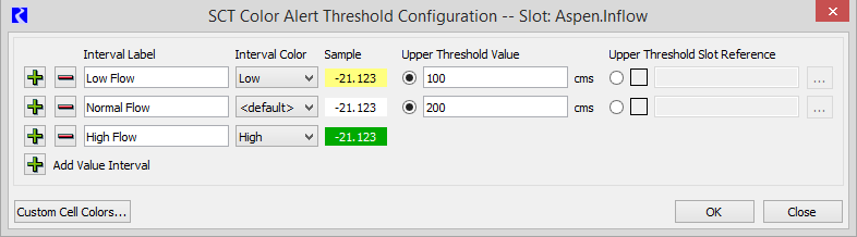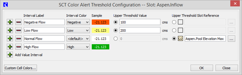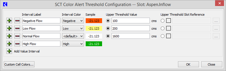 The SCT Color Alert Threshold Configuration dialog appears for that slot. By default, there is a Normal interval, which uses the default cell flag color. You can define any number of alert intervals and their associated colors.