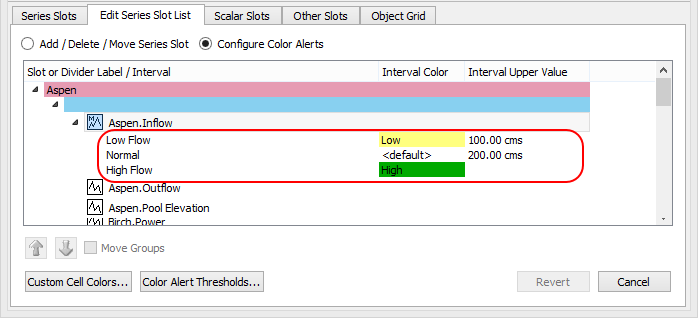 The SCT Color Alert Threshold Configuration dialog box closes, and the Edit Series Slot List tab is updated with the interval specifications you have defined.