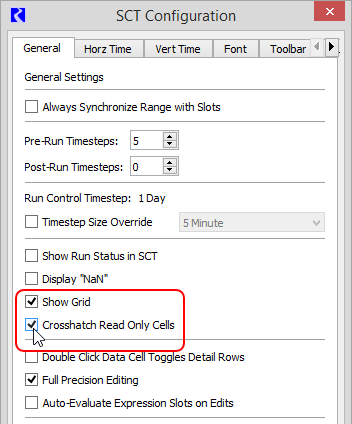 3. Select or clear the Crosshatch Read Only Cells check box, as follows. Read-only cells contain non-editable values. These include cells for expression slots and accounting system slots.