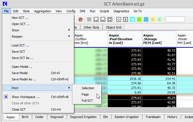 The printout includes the SCT row and column headers and the data table. The page headers and footers include the RiverWare version, model name, date, and page number.