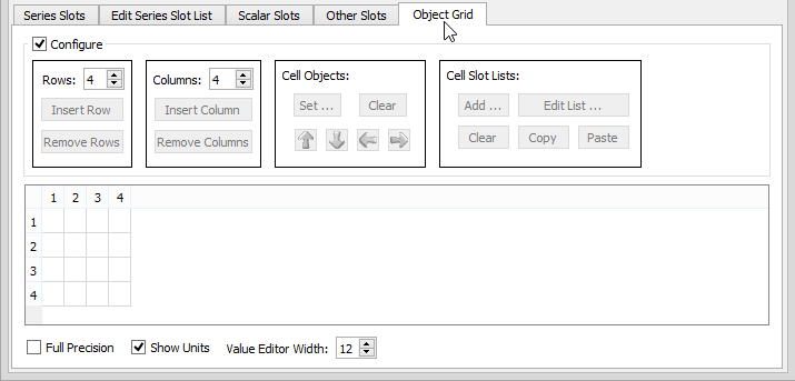 The object grid is empty. By default, a new object grid is configured for four rows and four columns.