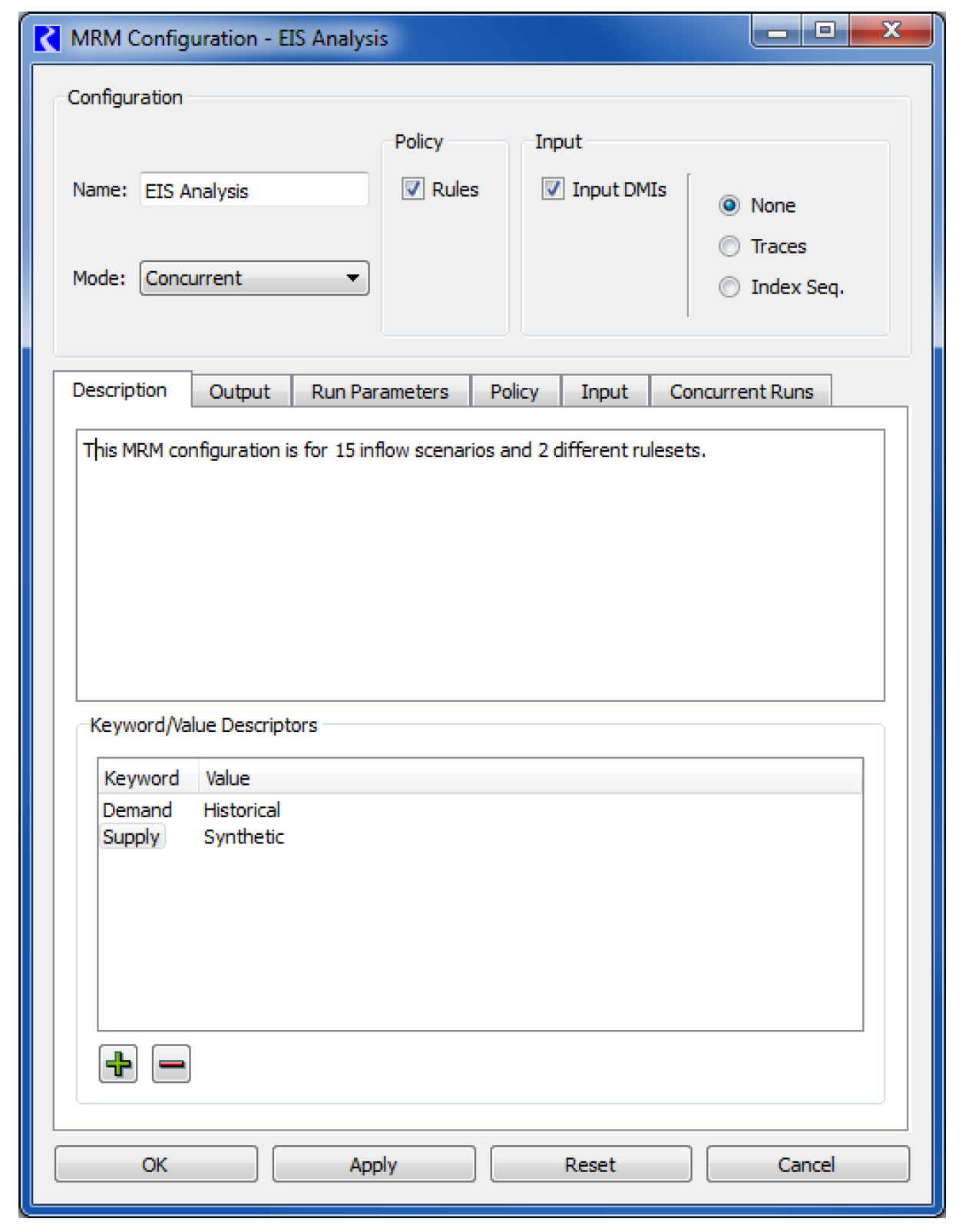 Keyword/Value Descriptors are user-entered to describe the MRM configuration. For example, these could indicate something about the data being brought in by DMIs, something about the ruleset, or anything else the user would like to document. These descriptors can optionally be written into CSV or netCDF files output from the multiple run as described. See