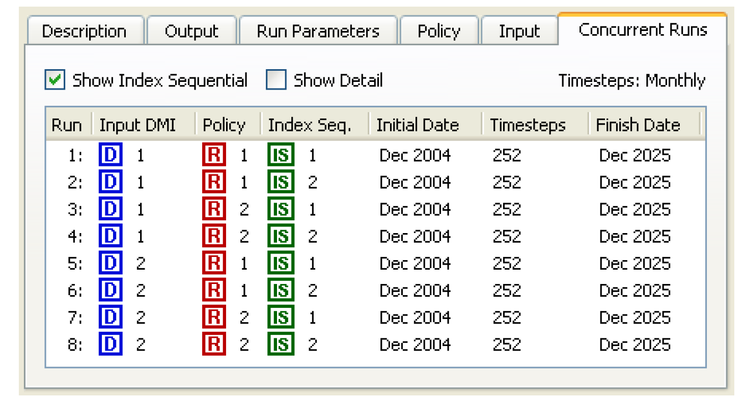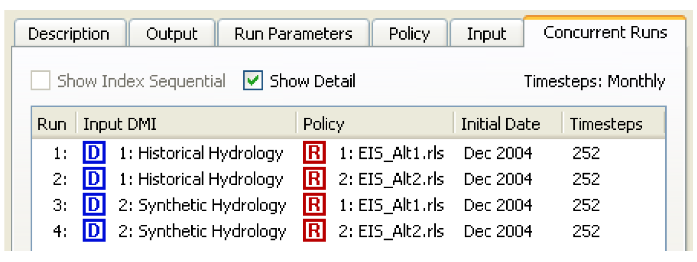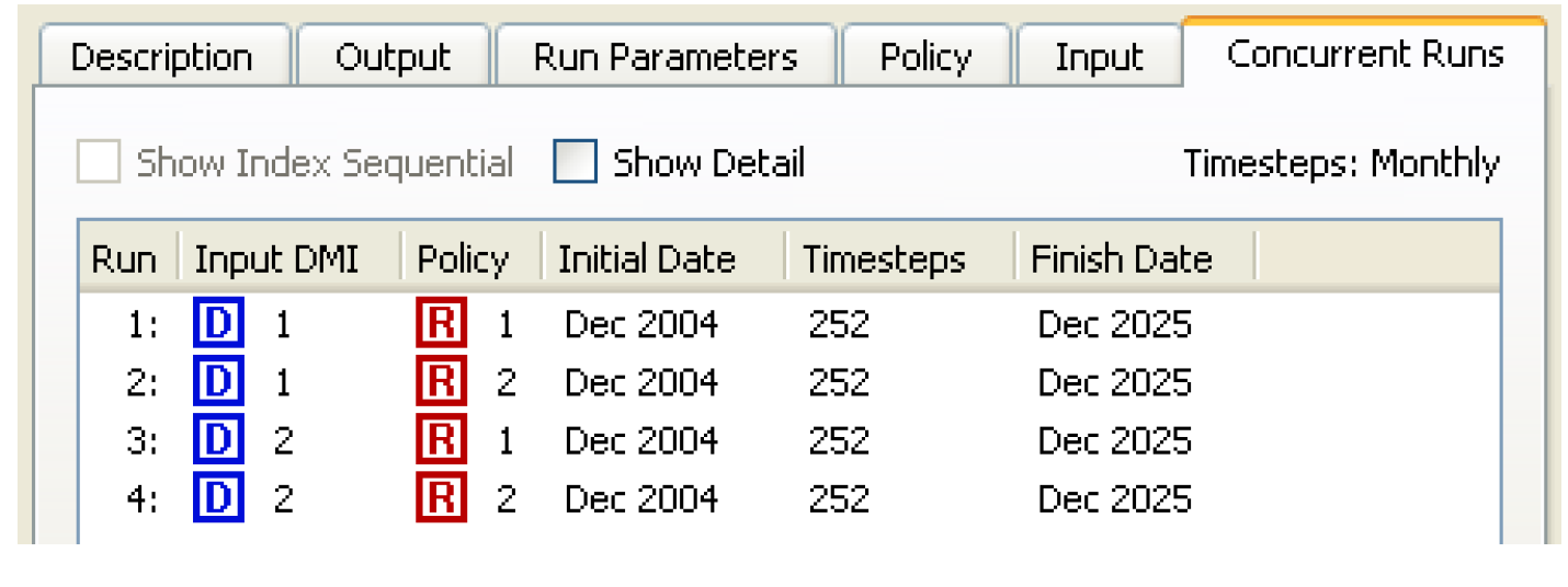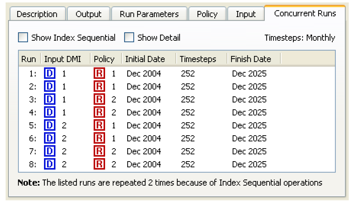 Concurrent runs are multiple runs of which the time horizons are identical. The begin and end times, and timestep length, are the same for all runs. Concurrent runs are used to run the model multiple times with different inputs for each run. Inputs include rulesets (policy alternatives), input DMIs (i.e. series data like alternative hydrologies), and/or index sequential (data sampling technique). For concurrent mode, the Run Parameters tab is shown.