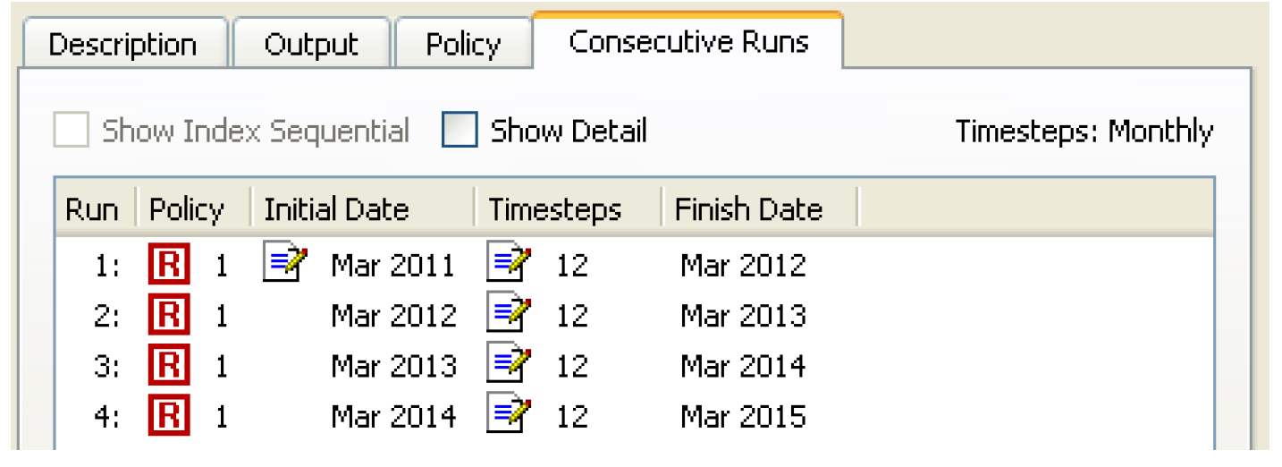 Consecutive runs are multiple runs where the time horizons are laid out consecutively. The end time of one run is the initial time of the next run. Timesteps do not vary among the different runs in a consecutive run.