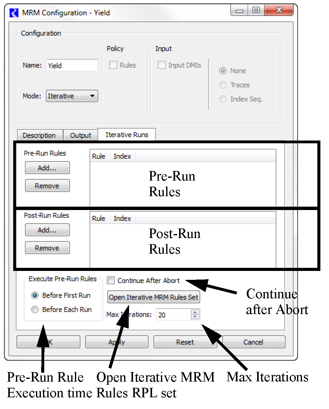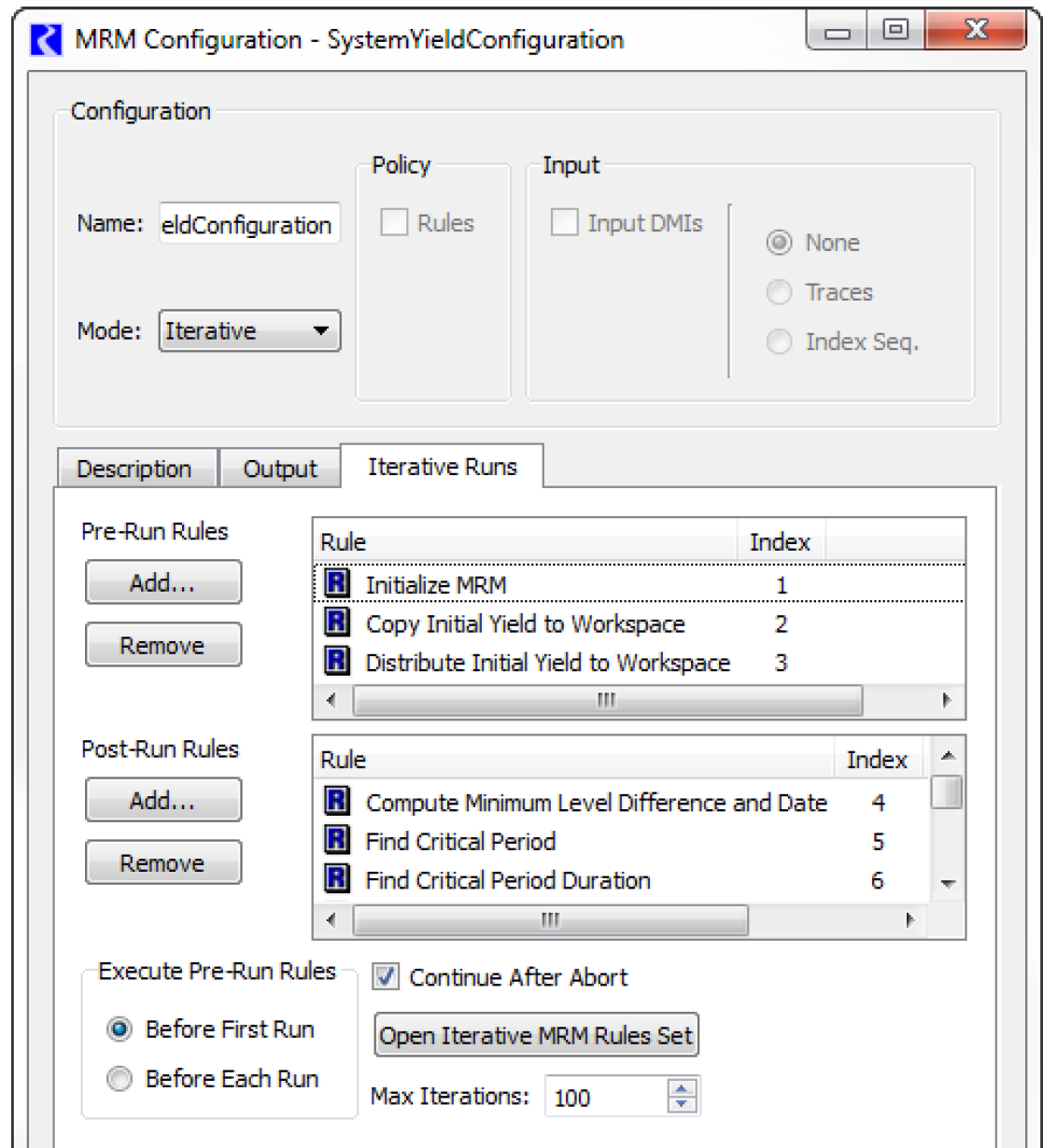 • On the Iterative Runs tab are the following significant areas: the Pre-MRM Run Rules, the Post-Run Rules, the Continue After Abort toggle, Pre-Run Rule Execution Time, the Open Iterative MRM Rules Set button, and the Max Iterations selector.