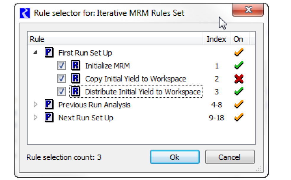 • Once the MRM Rules have been built, return to the Iterative Runs tab of the MRM Configuration dialog. In this tab, the define which of the MRM rules should execute as part of the PreRun rules and which should execute after each iterative run, or both. These are defined in the appropriate areas using one of the following methods