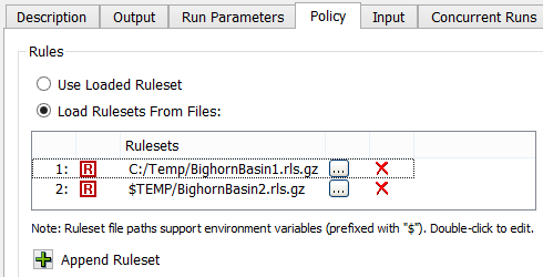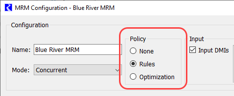 • Select Open Iterative MRM Rules Set button to open the Iterative MRM Rule set editor. This dialog operates very similarly to the standard RBS Ruleset Editor dialog. Create one (or more) Policy Group(s) and associated rules. The MRM Rules created are stored within the model file and may be available for use with any number of iterative MRM configurations. This set of rules can also be accessed from the workspace Policy, then Iterative MRM Rules Set.