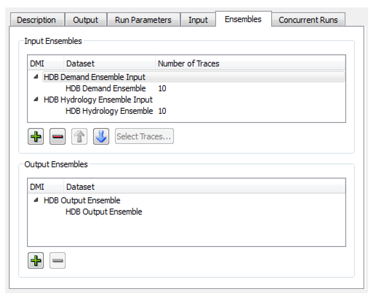 On the Ensembles tab select the Plus in the Input Ensembles frame to open a list of input DMIs defined in the model. Only valid input DMIs with HDB datasets configured with ensembles can be added.