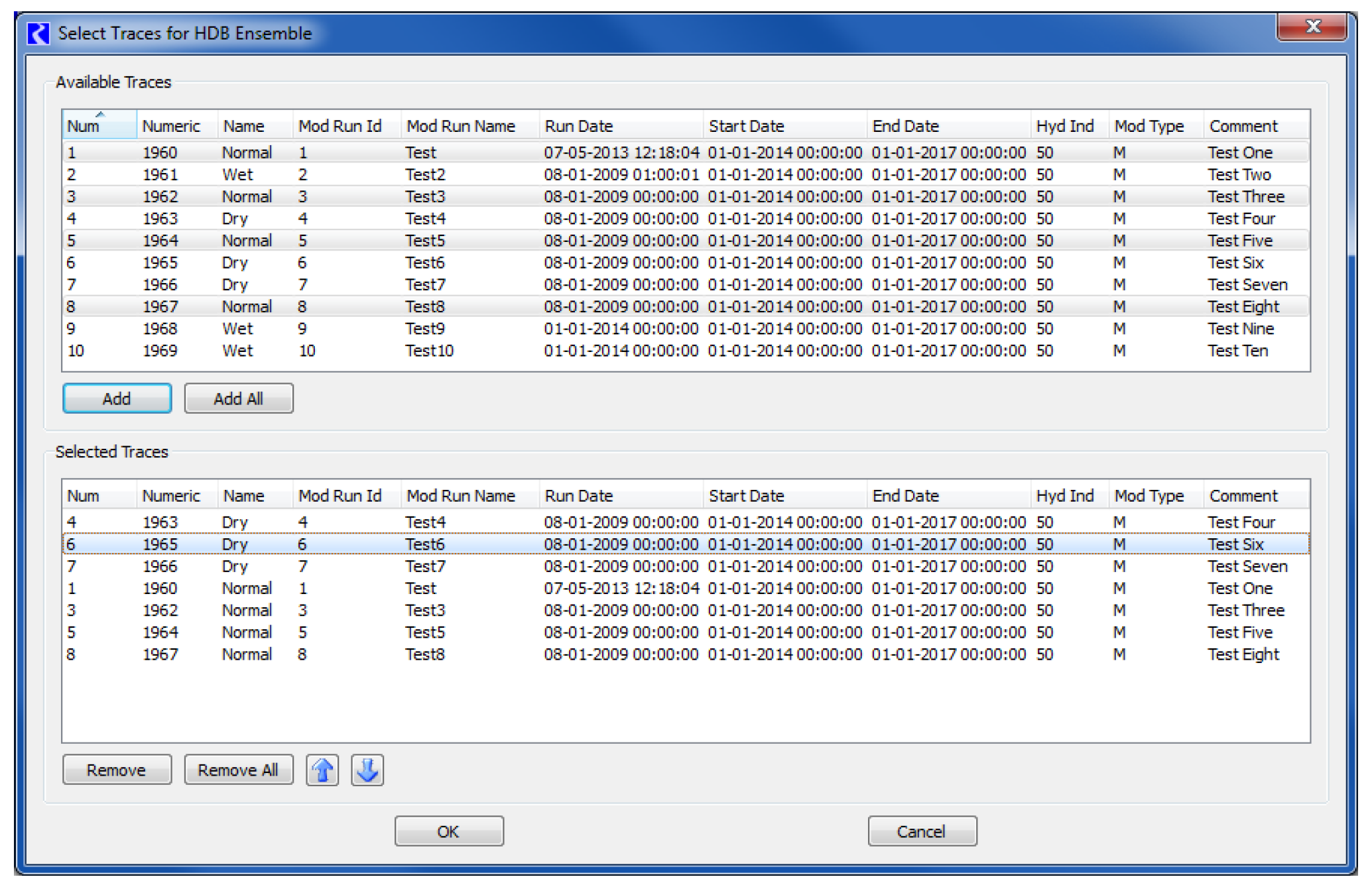 All available traces are presented in the upper list. When added using the Add or Add All buttons, they are copied to the lower list showing the selected traces. Traces can be removed from the selected list with the Remove or Remove All buttons. The selected traces can be ordered using the up and down arrow buttons. With these controls, a subset of traces in the ensemble can be chosen and used in any order as input to the multiple run. When applied with the OK button, the number of selected traces will appear in the Number of Traces column in the Input Ensembles frame of the Ensembles tab.