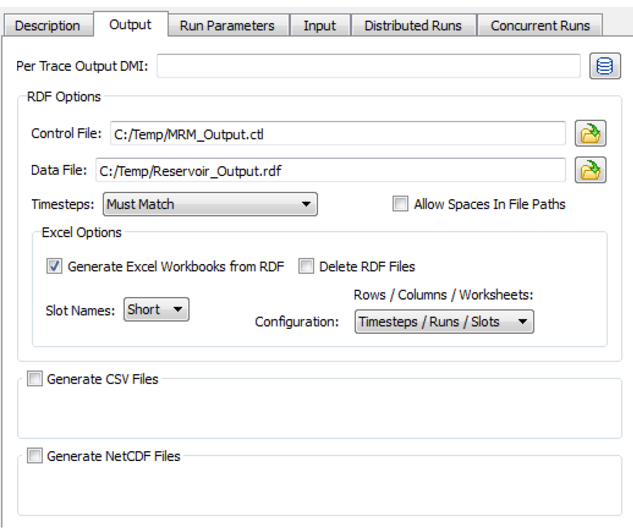 During a multiple run, output can go to an output DMI and/or one or more RiverWare Data Format (RDF) text files. Options are also available to send output to CSV files or NetCDF files. Select the Output tab of the Multiple Run Editor. The following figure and subsequent sections show the configuration options: