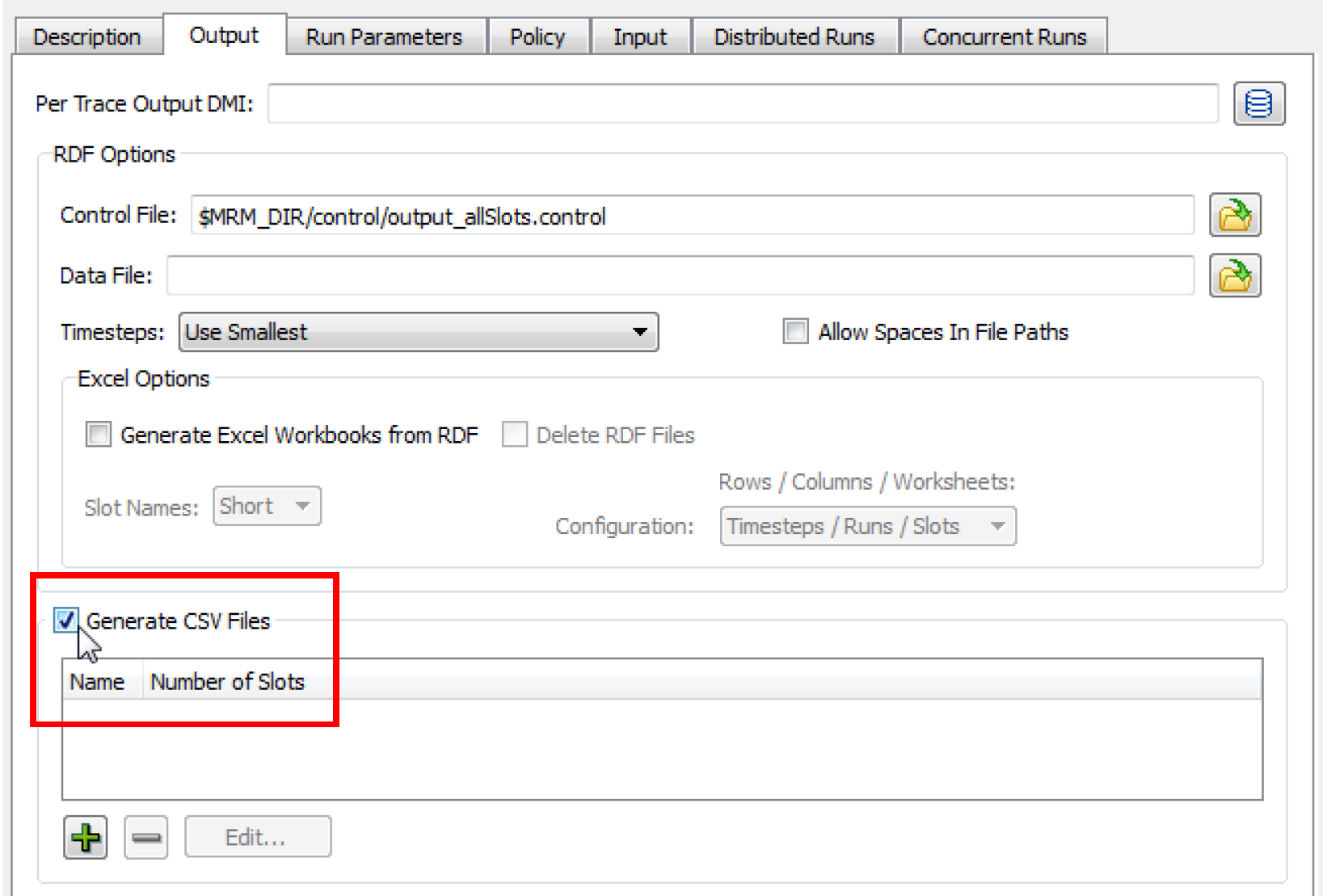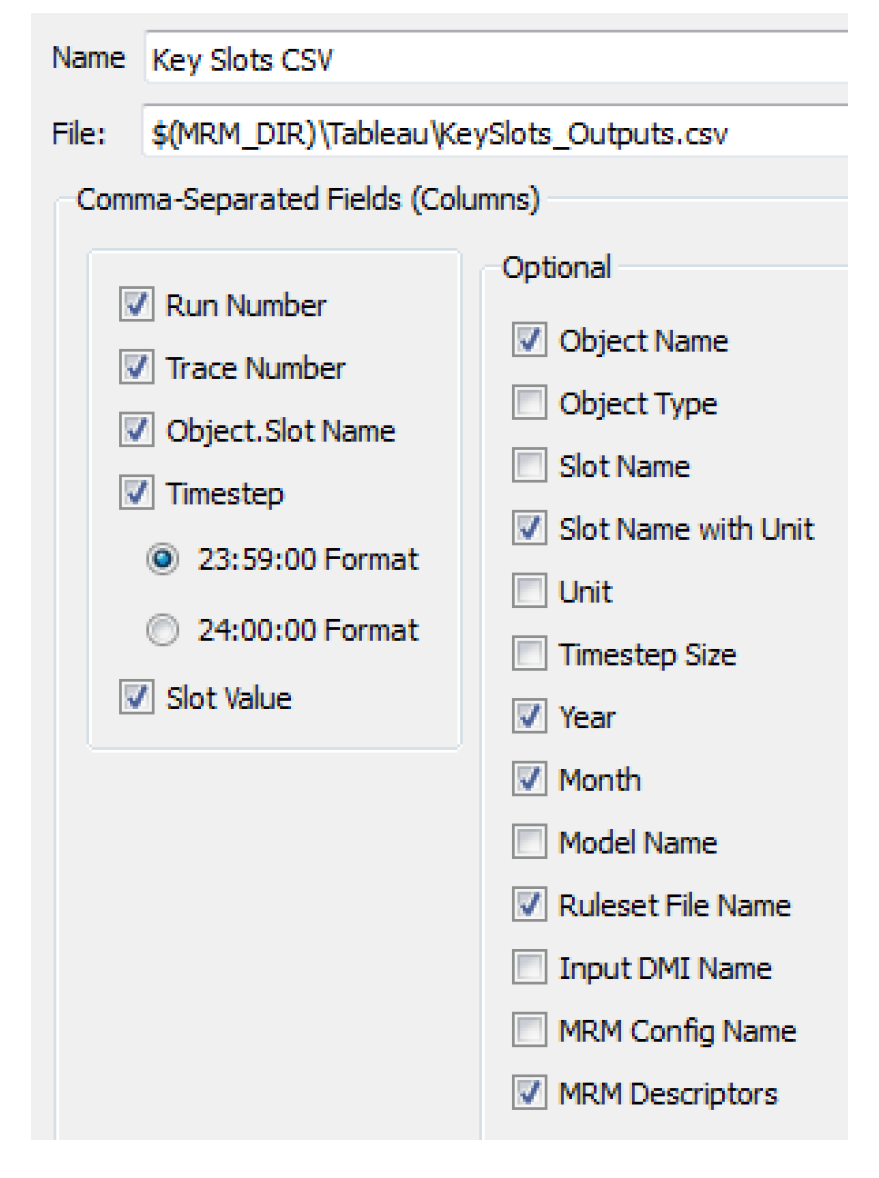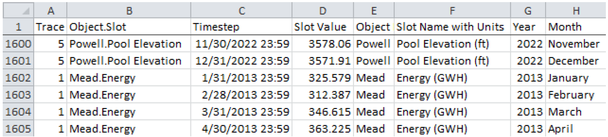 During the MRM run, RiverWare will write the outputs to the specified CSV file. The file will contain one row for each selected slot at each timestep for each run. For each row, the columns will be filled in appropriately by RiverWare based in the selected dimensions.