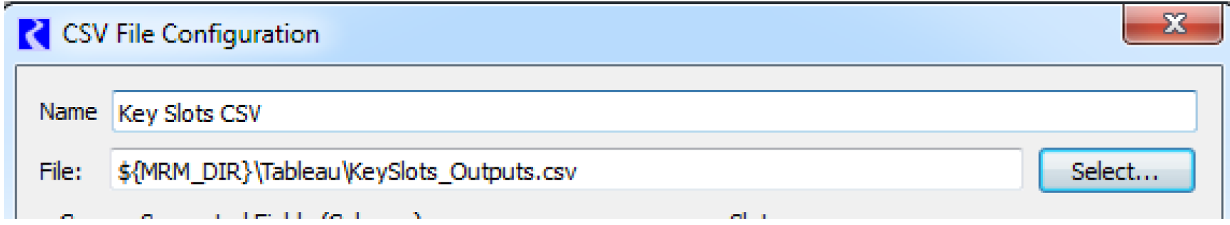 Figure 3.6 shows the list of available elements. The CSV output file will contain a column for each item selected. The text shown in the CSV File Configuration dialog will be used as the column header. The Slot Value column is the only column that will contain true “output” data from the MRM run. The Slot Value will be considered a “measure” within Tableau. The remaining columns contain information associated with each Slot Value and will be considered