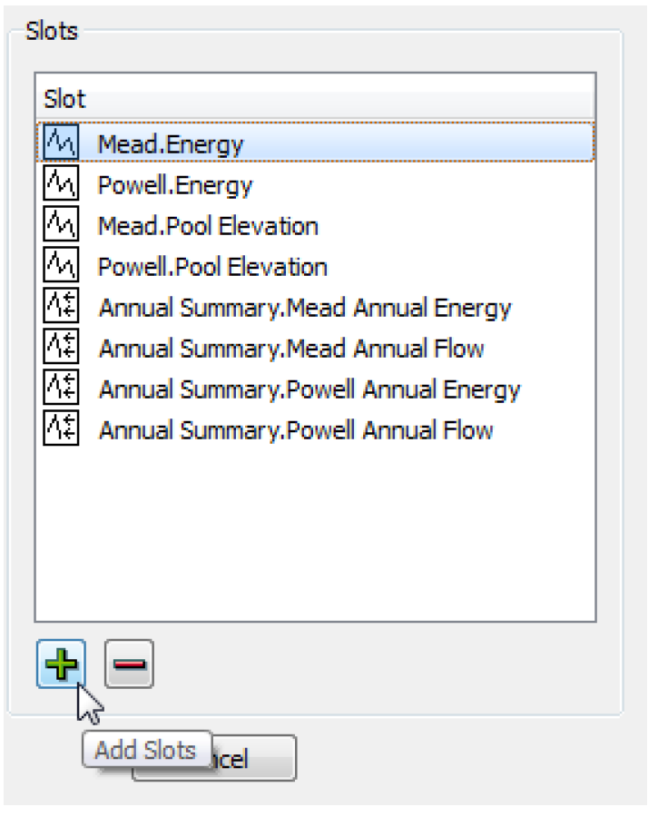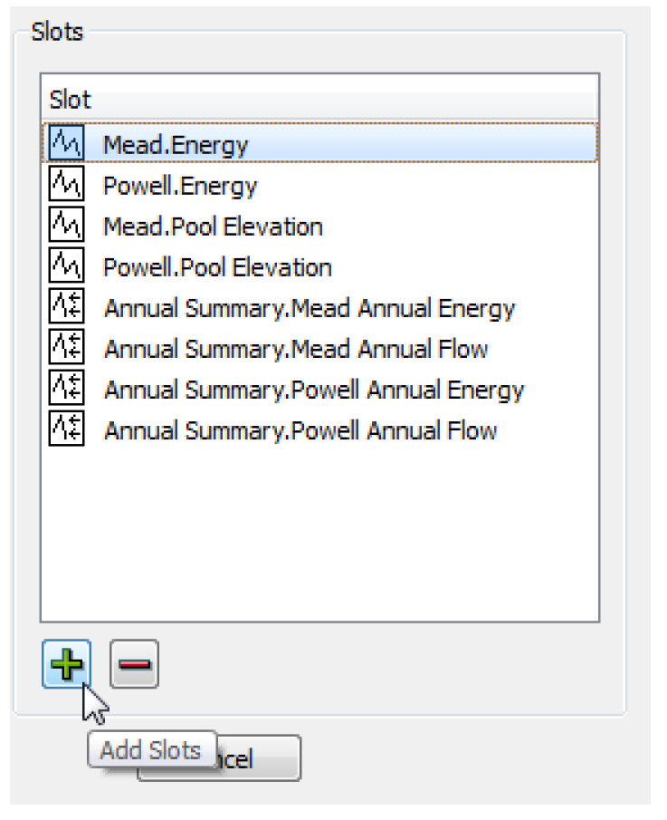 6. Then add slots to the netCDF output by selecting the Plus sign below the Slots panel. This will open a slot selector dialog, which can be used to add the desired slots. A slot can be removed from the selection by selecting it in the list to highlight it, then selecting the Minus sign. The Object.Slot name will be used as the variable name in the netCDF file.