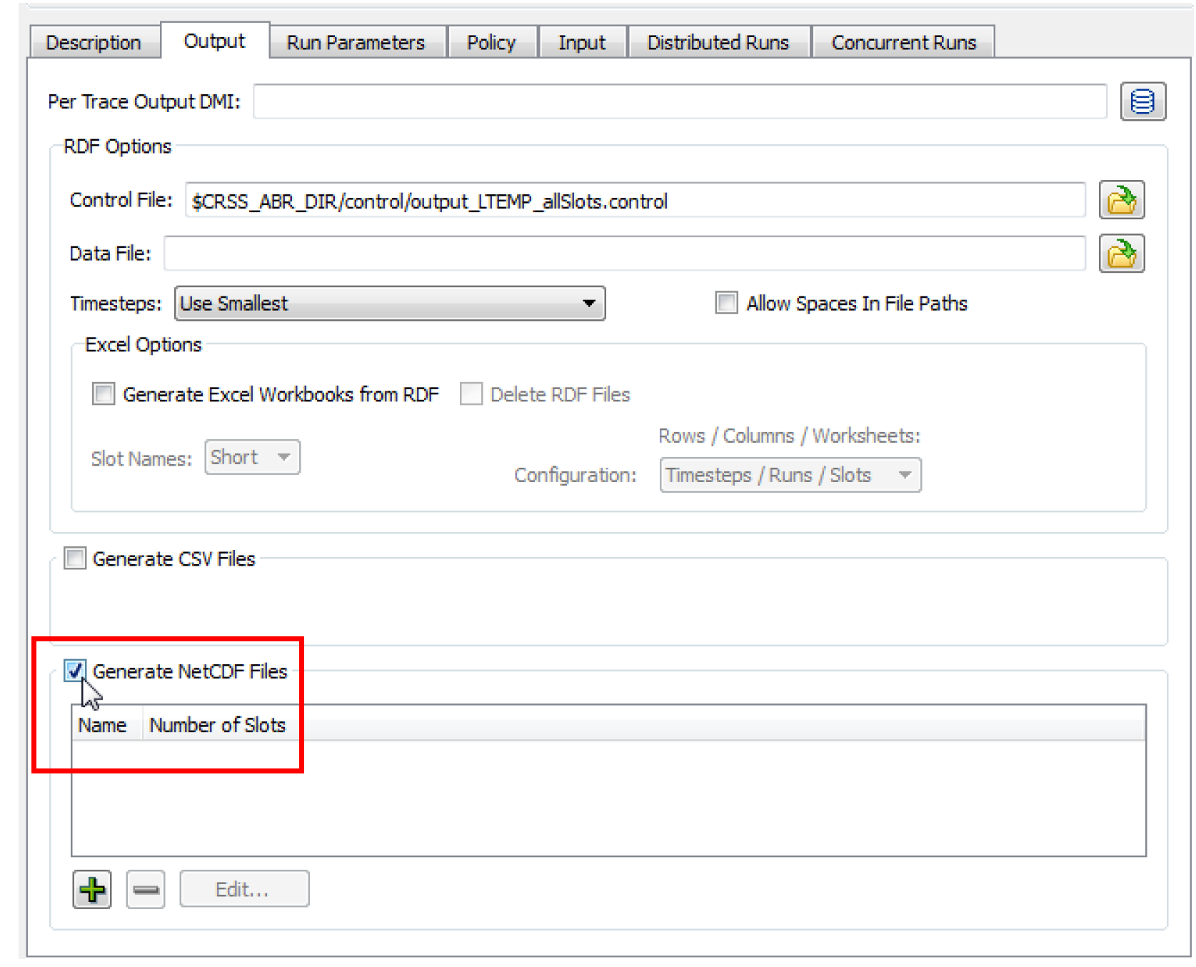 2. Select the Plus sign to add a new netCDF output file. Then select Edit to configure its contents. This will open the NetCDF File Configuration dialog.