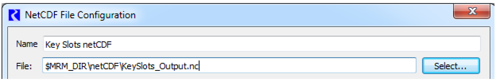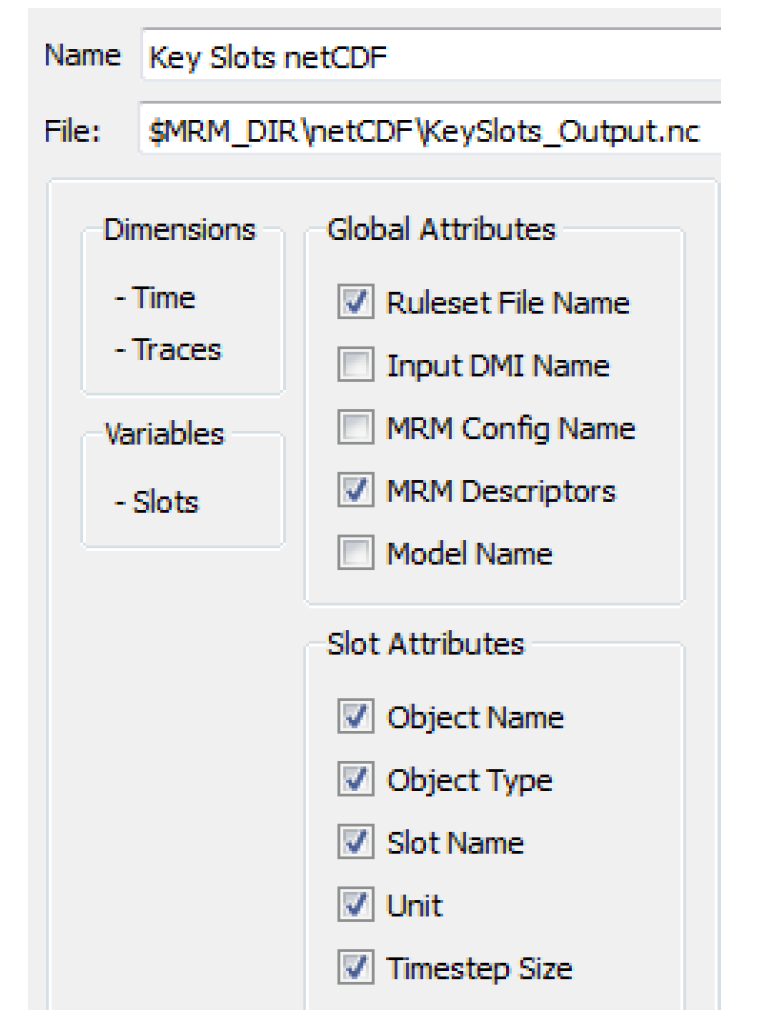 Network Common Data Format (netCDF) files can be generated from the MRM run outputs. The configuration allows for the selection of various pieces of information to be used as global attributes and slot (variable) attributes. Time and Traces are treated as dimensions.