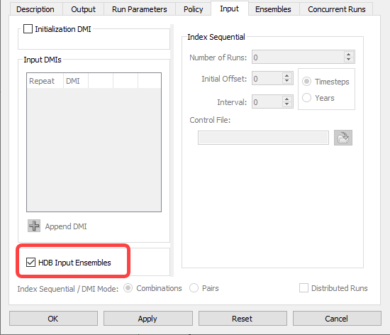 To utilize HDB Ensembles, on the Input tab of the MRM configuration, select the HDB Input Ensemble option at the bottom left of the Input tab. This will disable Input DMIs, Traces, and Index Sequential functionality as the ensembles will determine the number of runs in the multiple run.